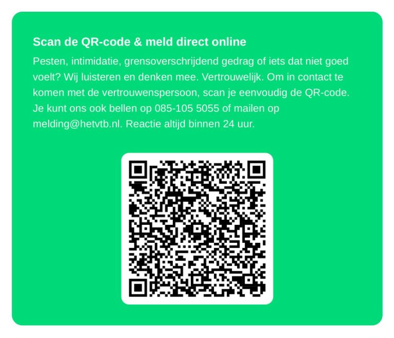 - Indien dit niet mogelijk blijkt, zal de directeur of intern begeleider u doorverwijzen naar onze externe vertrouwenspersoon, Mattis Wibbens, mattis@hetvtb.nl, 085-1055 055.